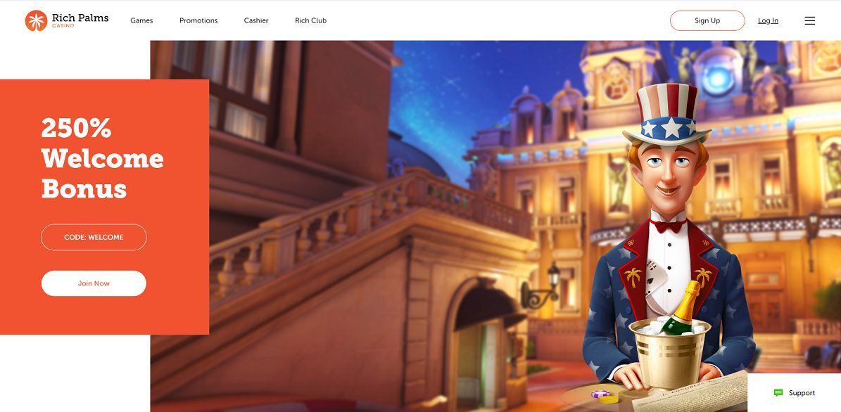 Rich Palms casino was founded in 2020, making it a new operator. The casino states that it has a license from Curaçao, but the website lacks the license icon that casinos traditionally display. However, Rich Palms is connected through an affiliate program with Superior Casino , 24VIP Casino and 888 Red Tiger Casino.